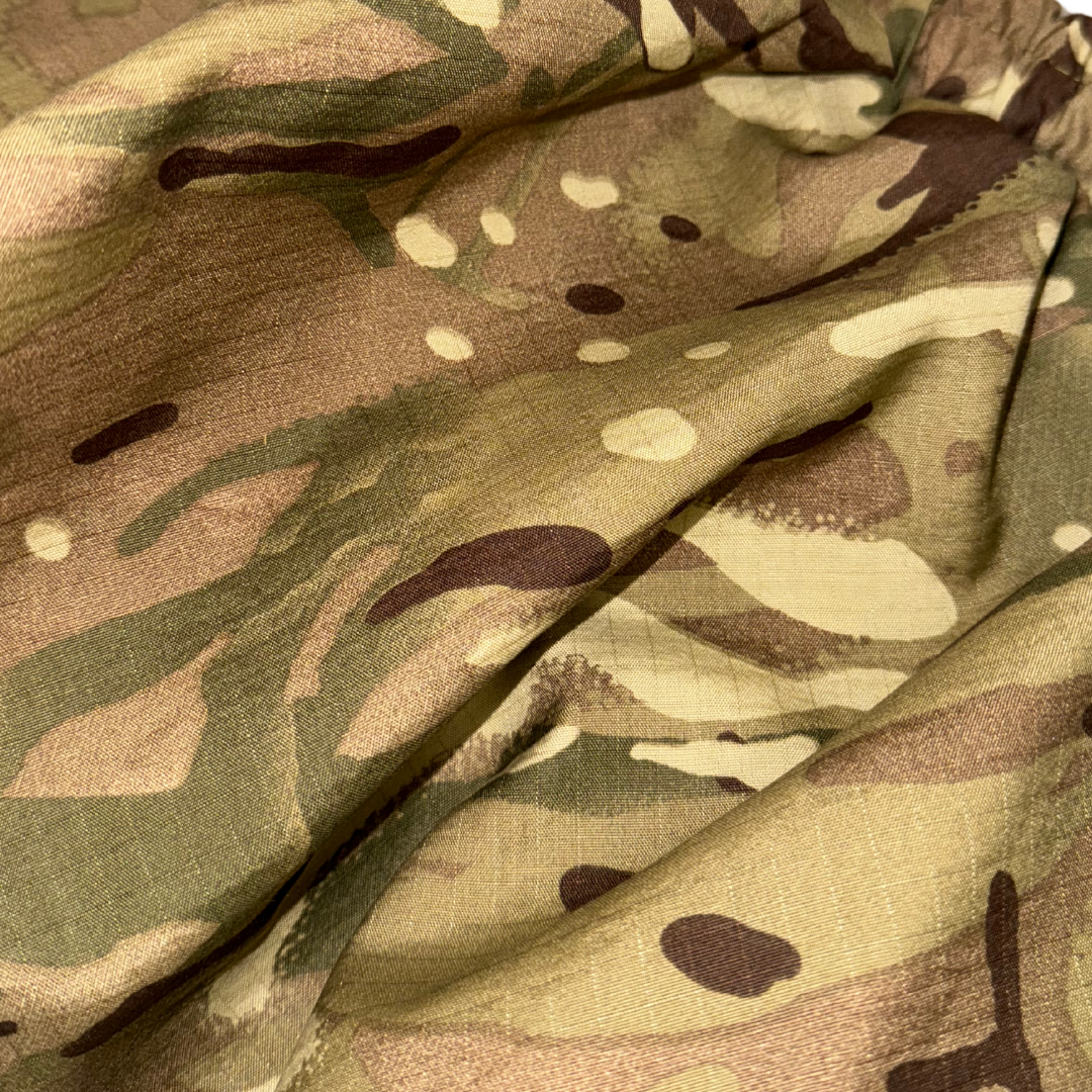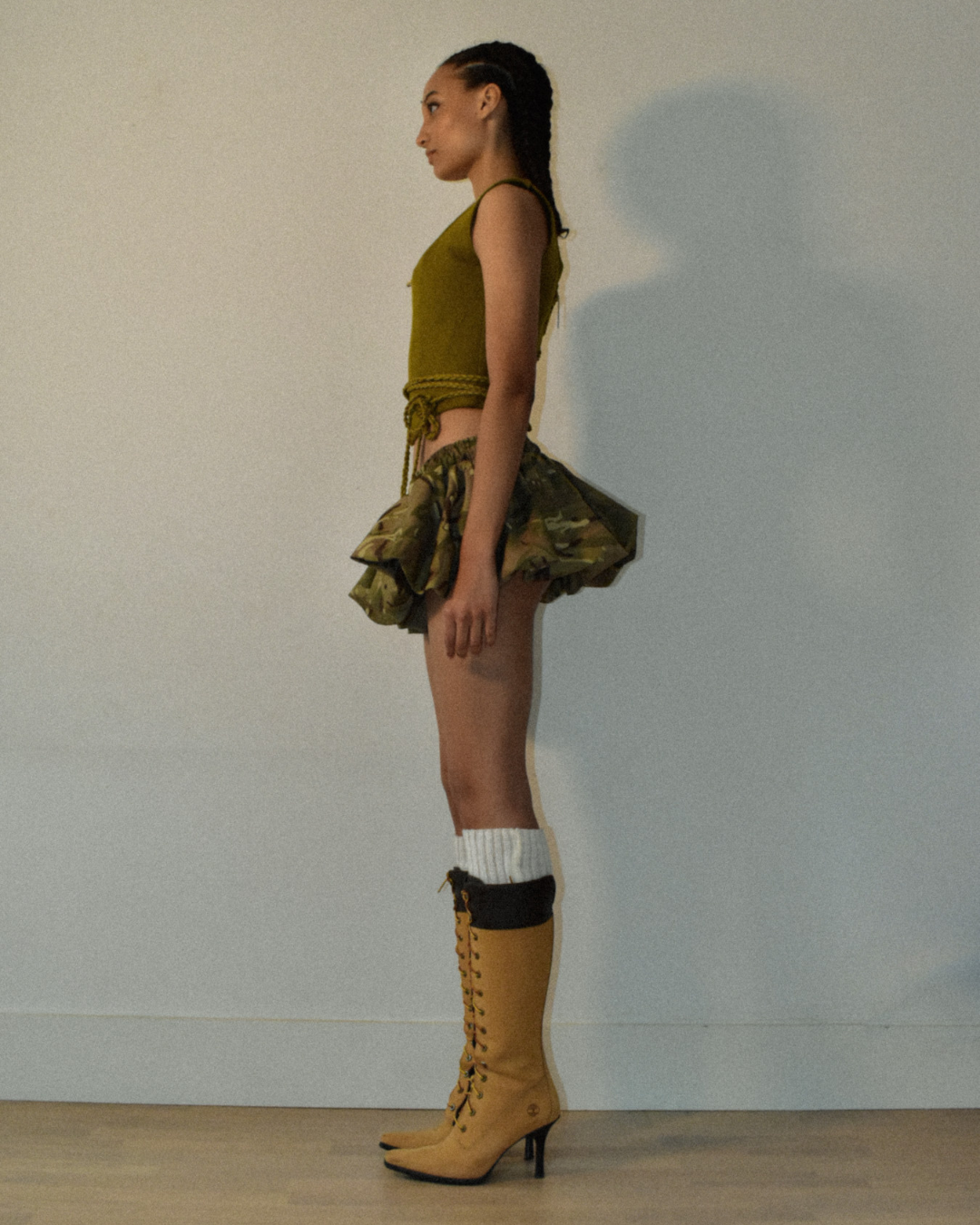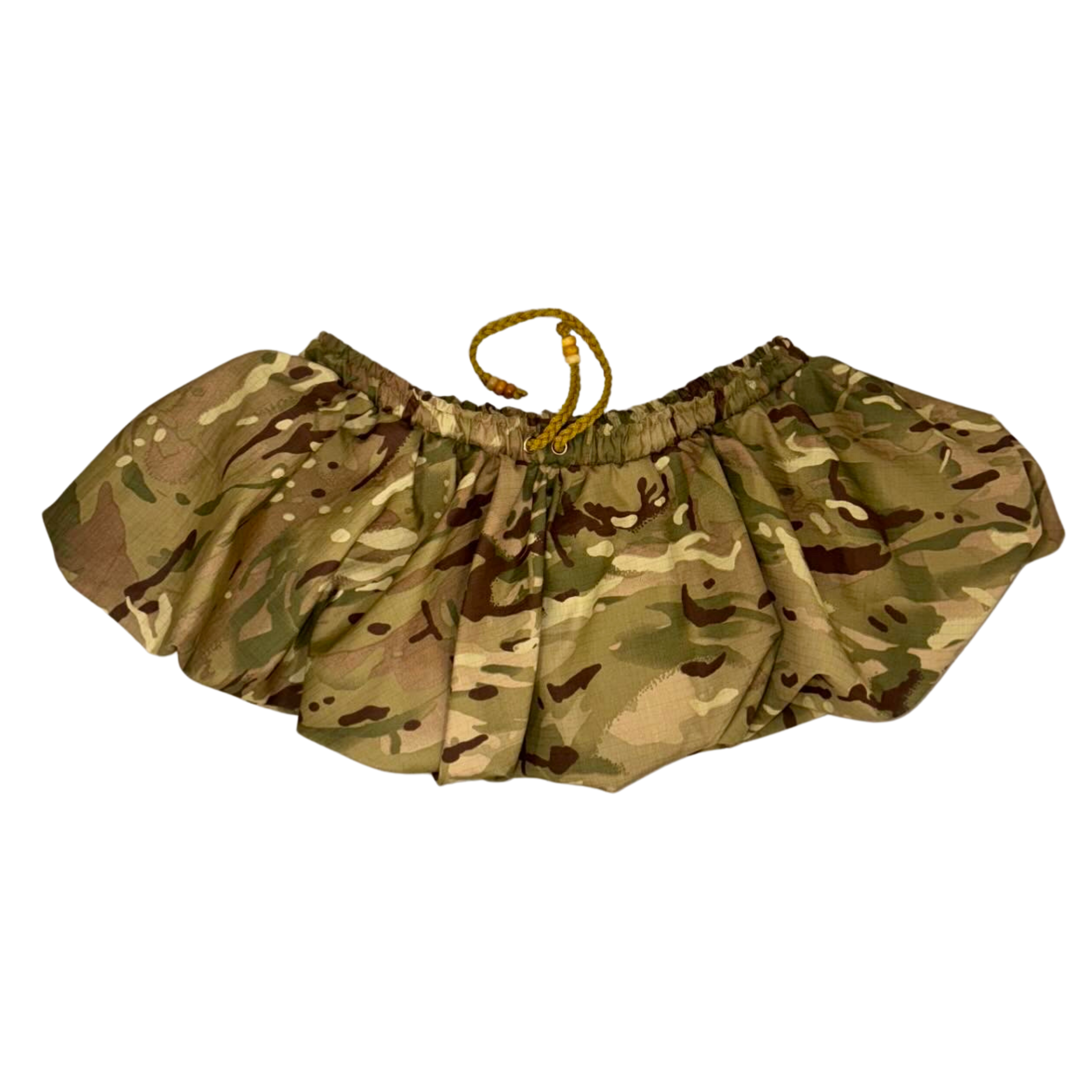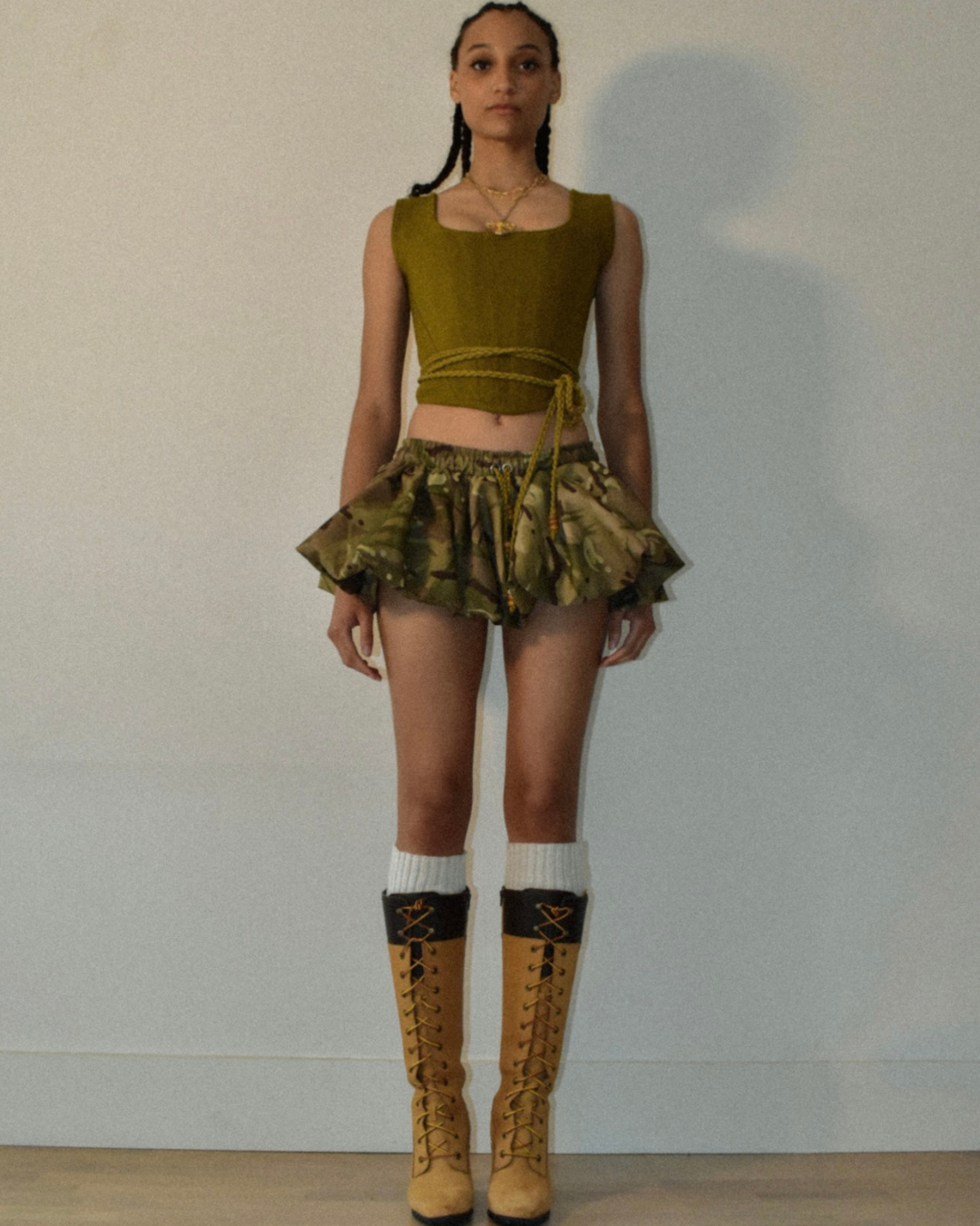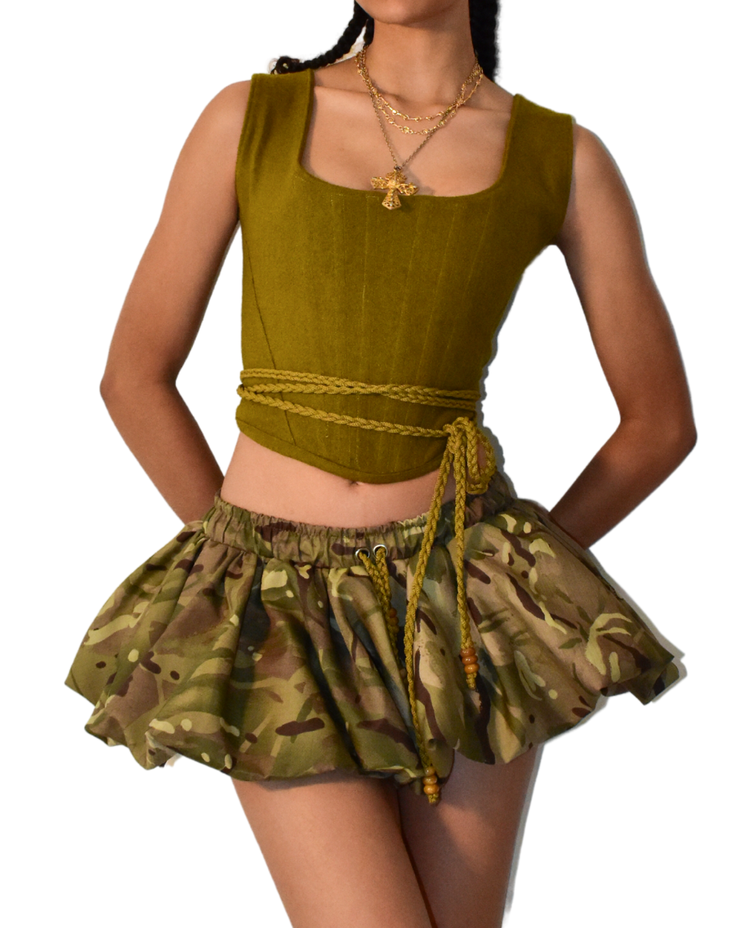 The camouflage bubble hem mini skirt is crafted with a locally sourced deadstock waterproof camouflage fabric. The skirt has an elasticated waistband and is further enhanced with a braided drawstring that's finished with 3 jade gemstone beads at each end.