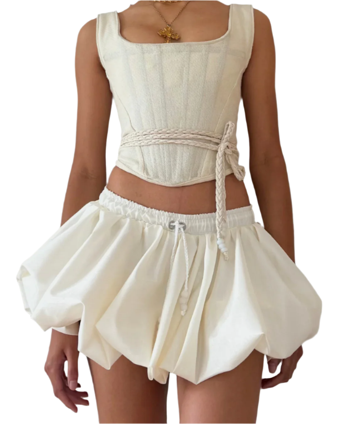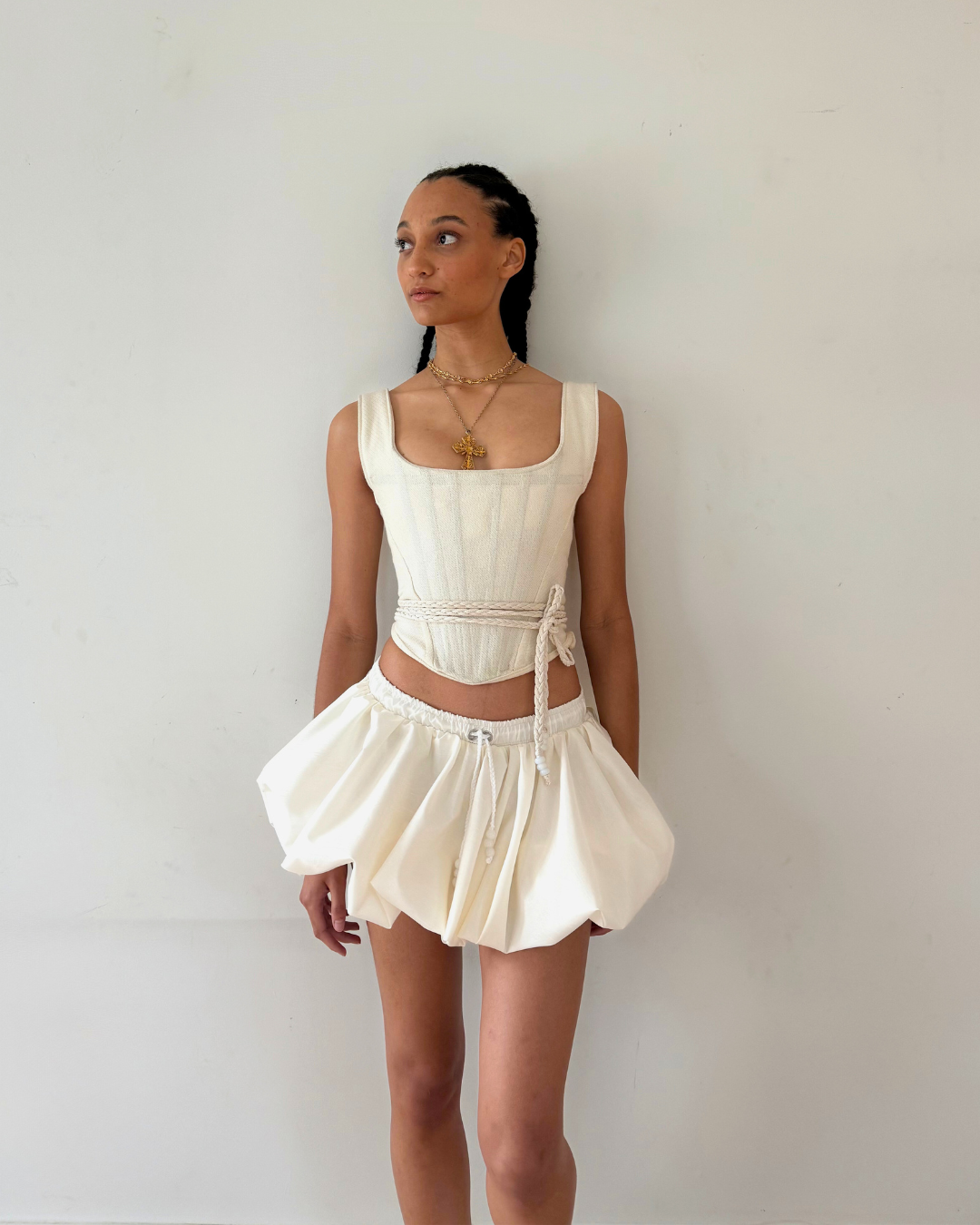The Ivory Bubble Hem Mini Skirt is crafted from a locally sourced deadstock taffeta fabric, offering a structured yet lightweight feel. Designed for both style and comfort, the skirt features an elasticated waistband and is finished with a braided drawstring adorned with natural opal gemstone beads at each end.
