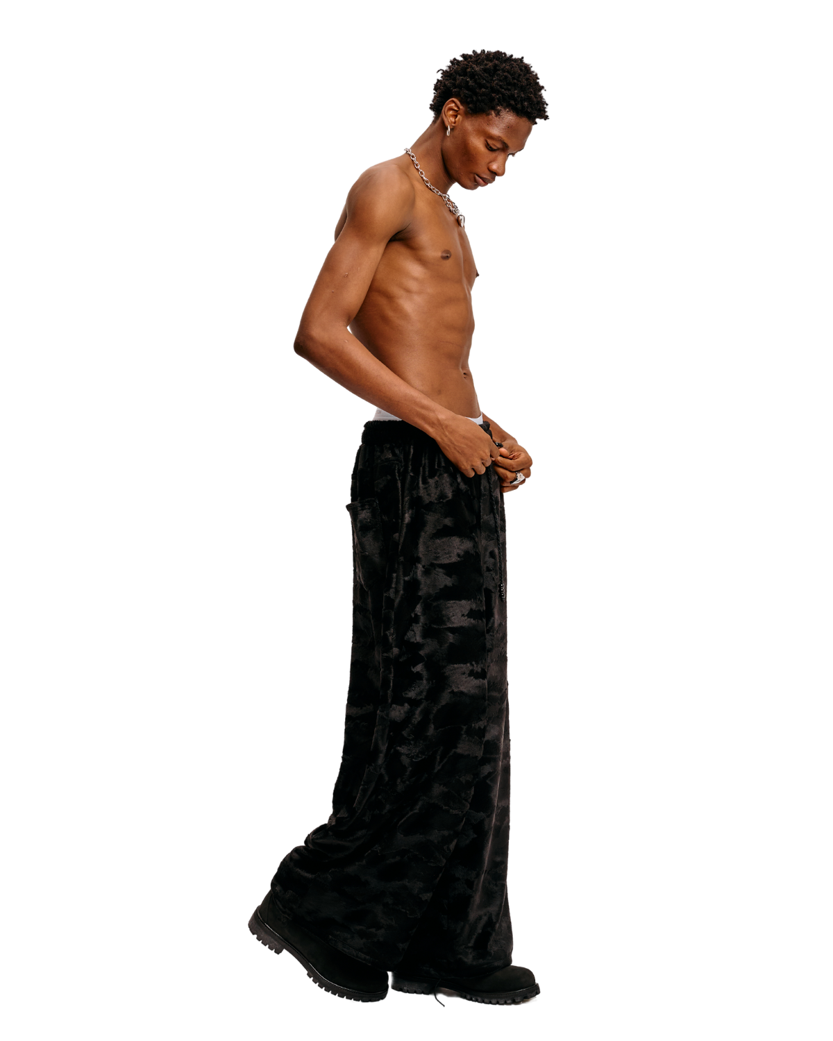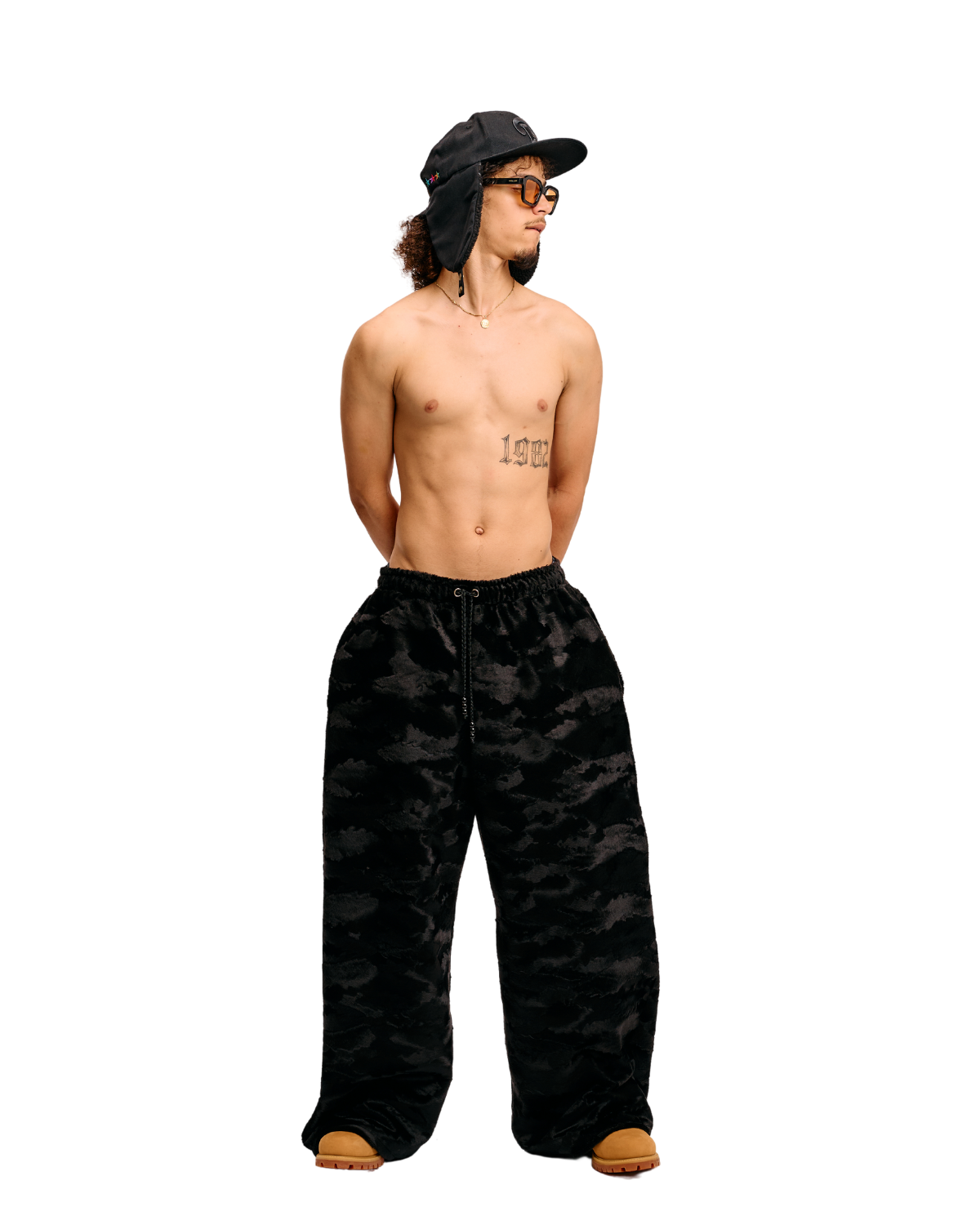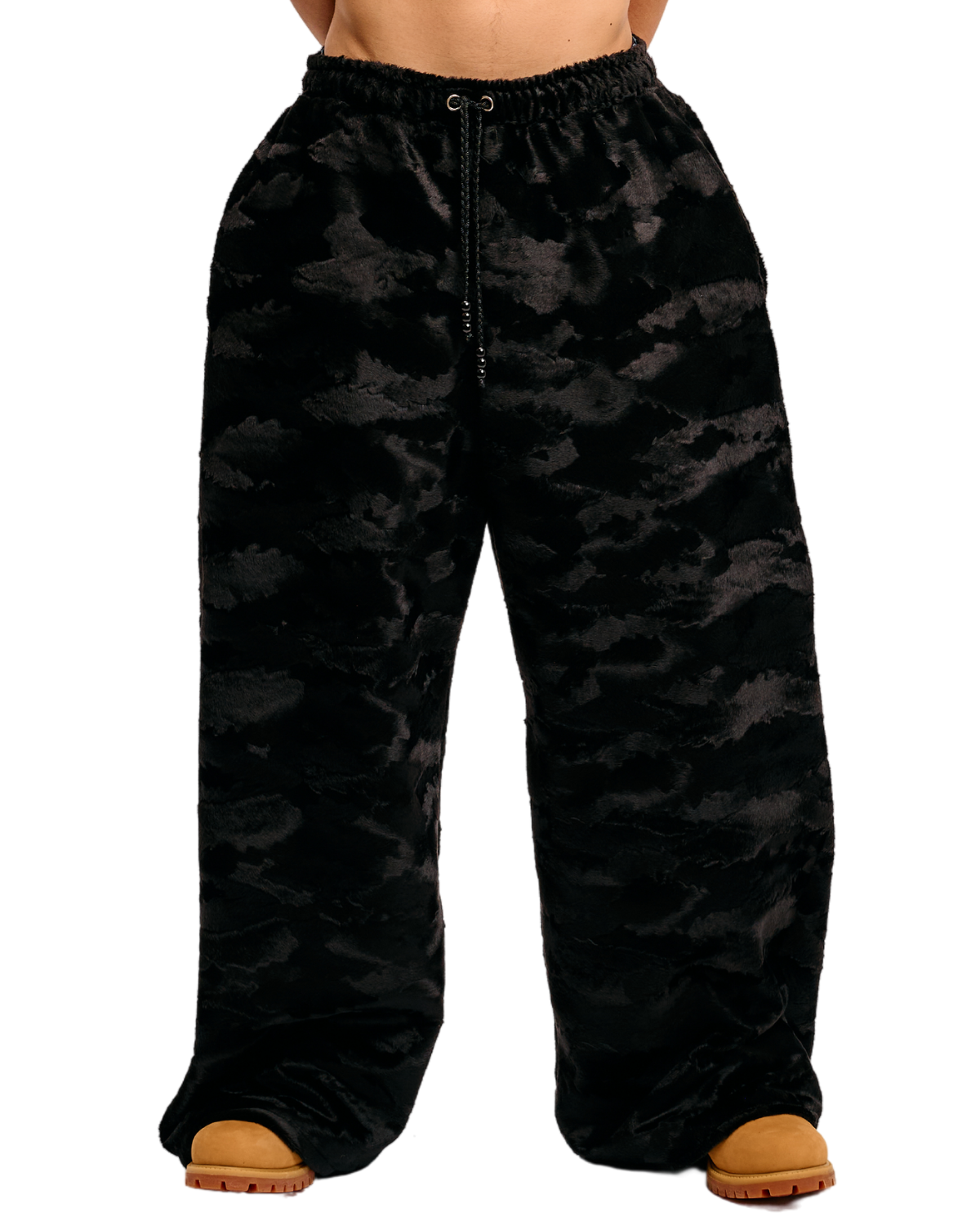 Ezímma's wide-leg tracksuit pants are crafted with a locally sourced deadstock faux fur fabric that boasts a soft texture and lustrous finish for a luxurious look. The pants have two side pockets, two back pockets and are further enhanced with a braided drawstring that's finished with 3 Obsidian beads at each end.
