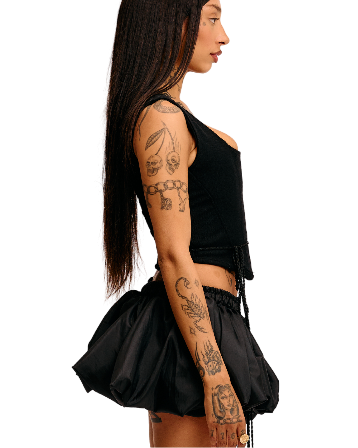 EZÍMMA'S CORSET IS CRAFTED WITH A LOCALLY SOURCED DEADSTOCK WOVEN WOOL FABRIC. THE CORSET FEATURES A BRAIDED DRAWSTRING THAT'S FINISHED WITH 3 NATURAL GEMSTONE OBSIDIAN BEADS.